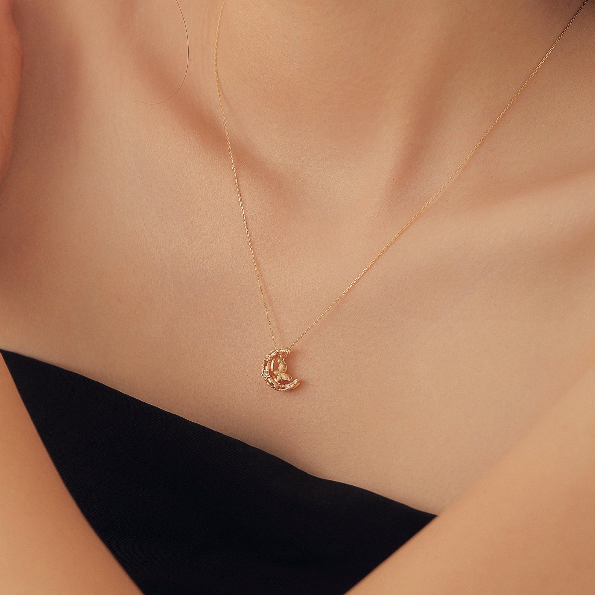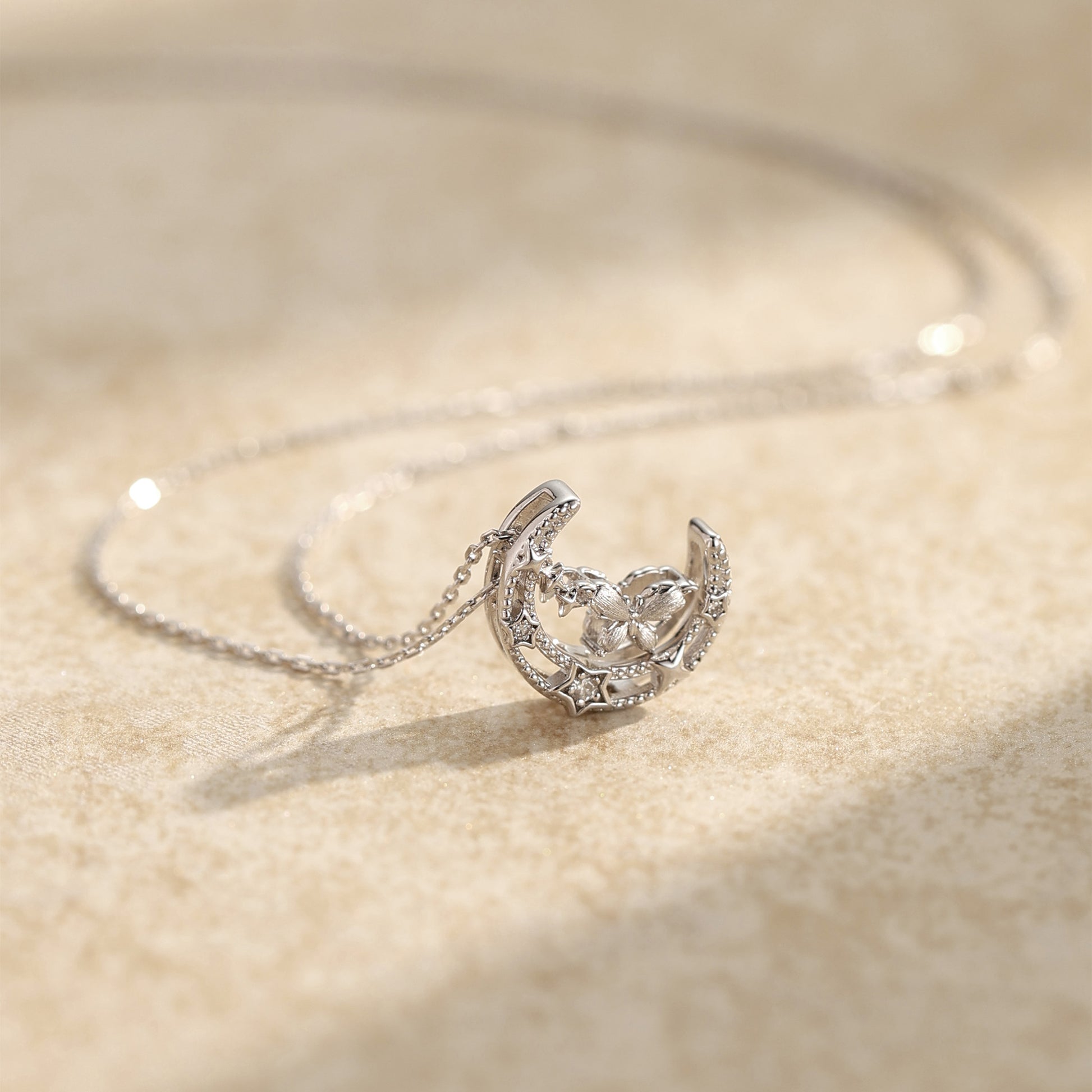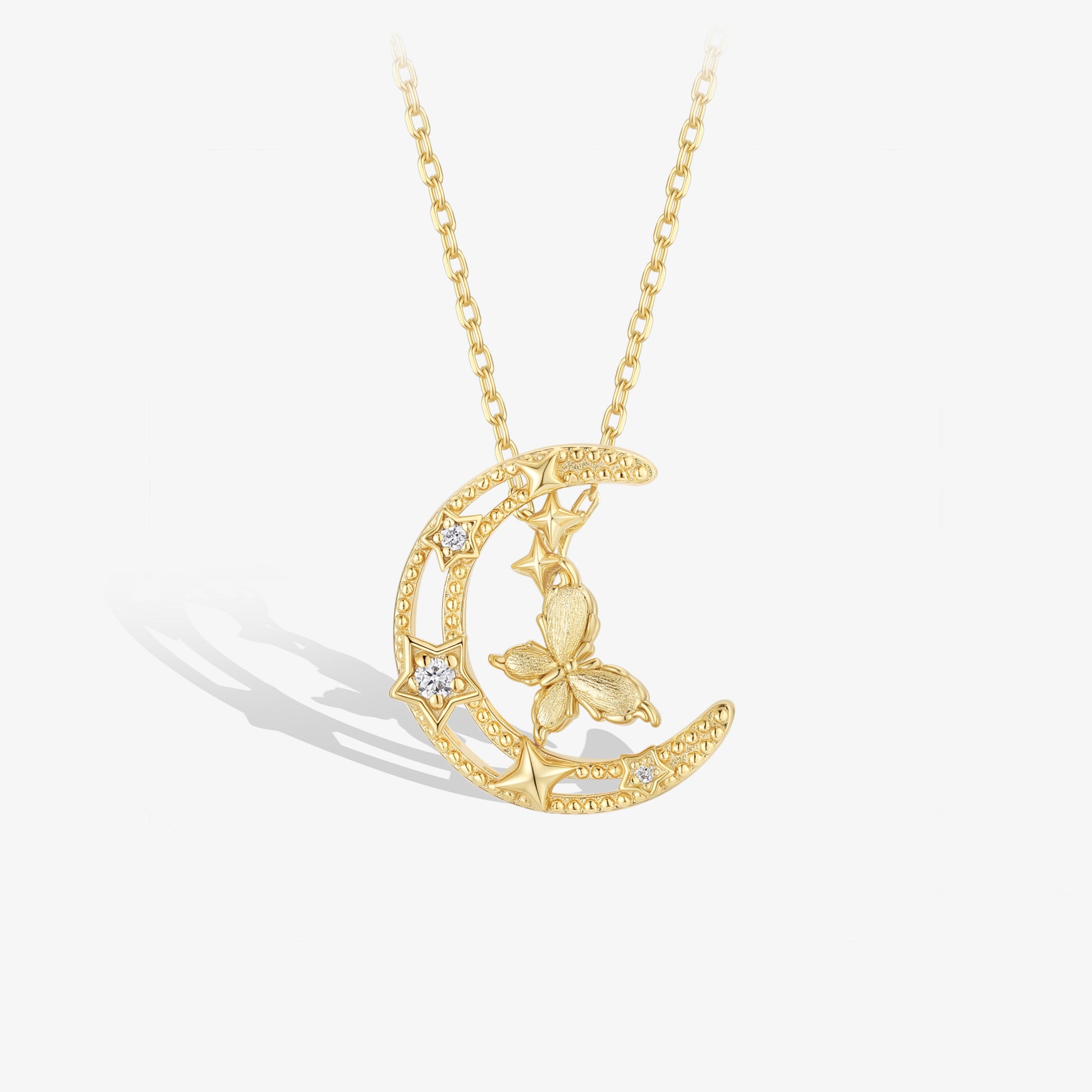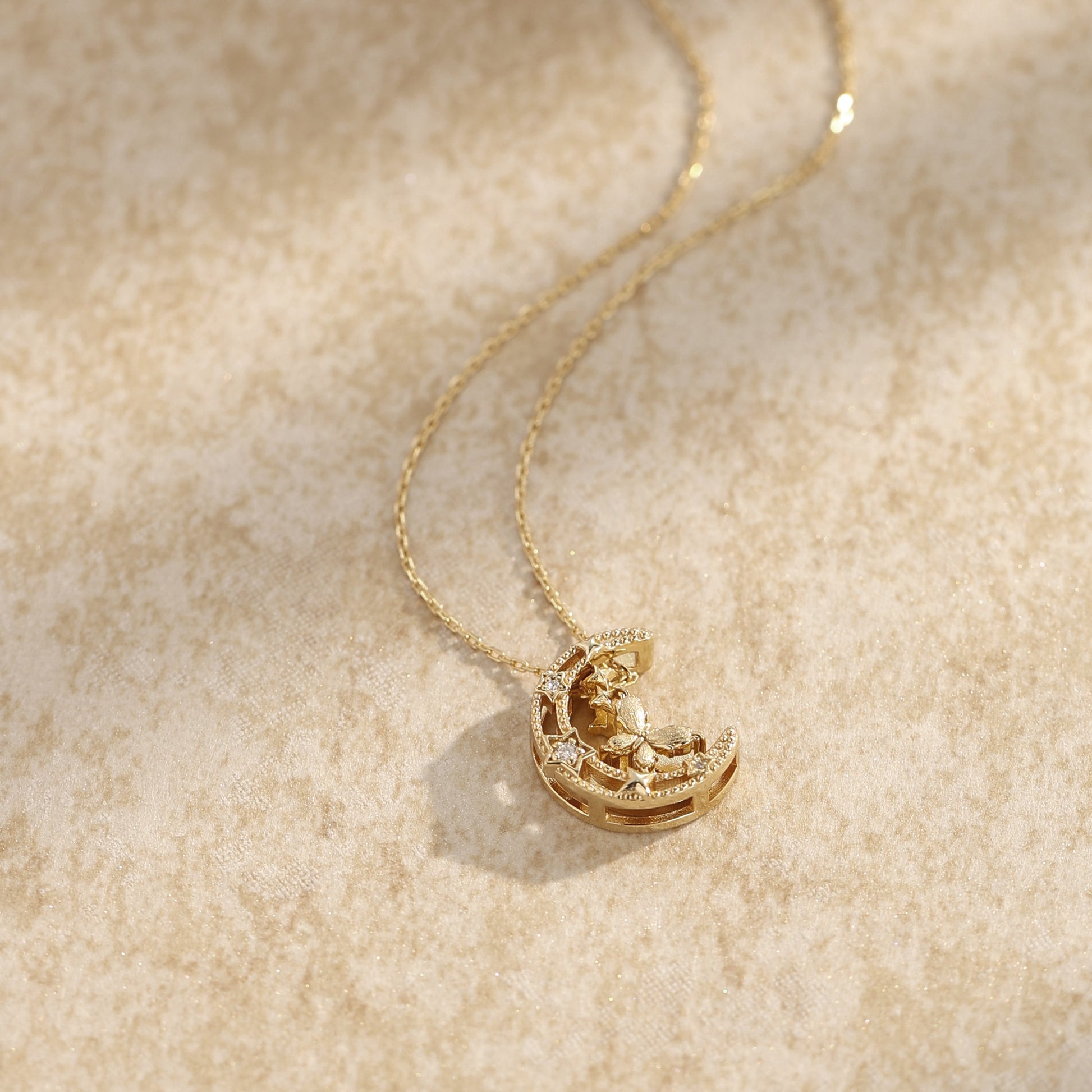 我們以手工拉絲工藝,讓一隻靈動的蝴蝶翩然落於彎月之上。蝴蝶的輕盈、月亮的曲線,每個細節都飽含手工製作的溫度與靈魂。月光下,鑽石與星芒錯落鑲嵌,宛若夜空中最明亮的星座,在您鎖骨間熠熠生輝。無論是搭配晚禮服還是簡約襯衫,它都能瞬間提升您的整體氣場。
