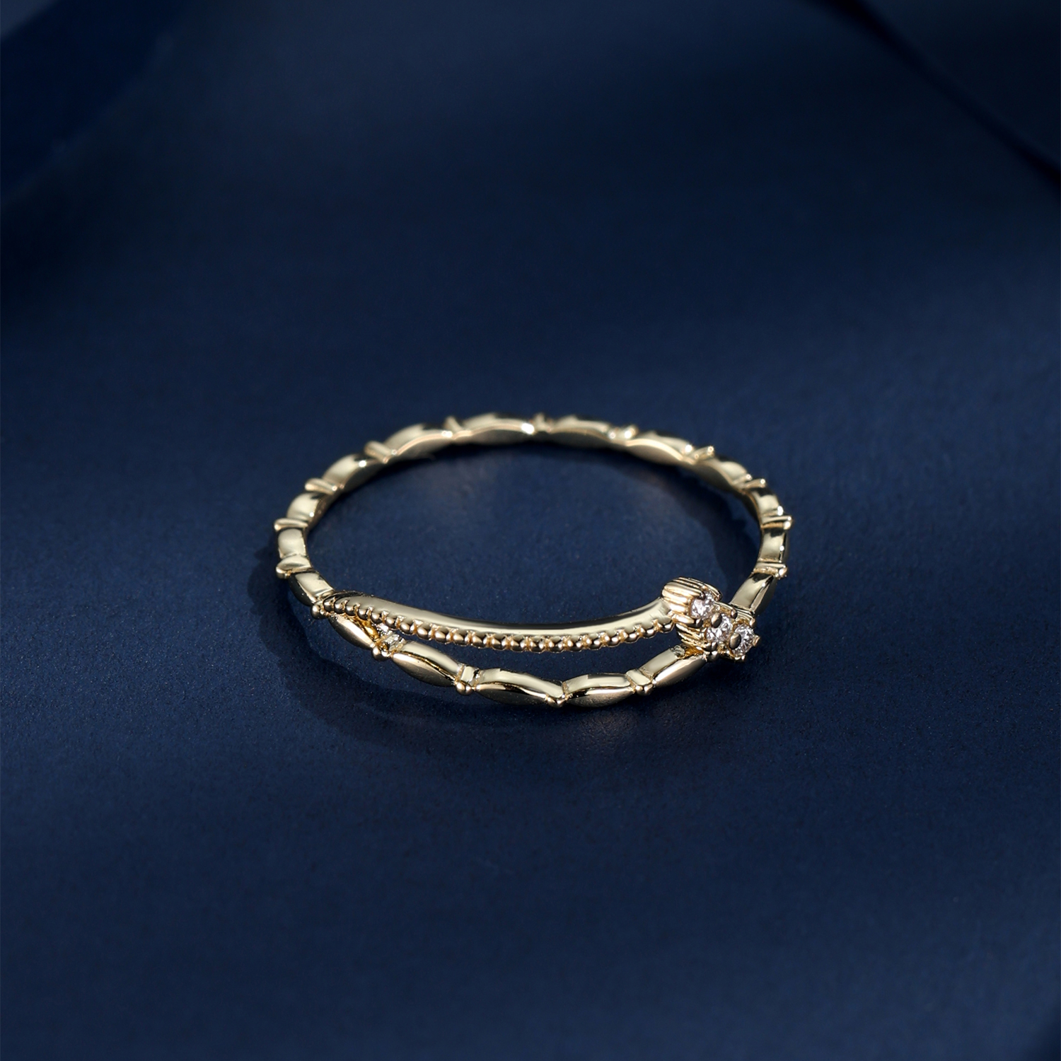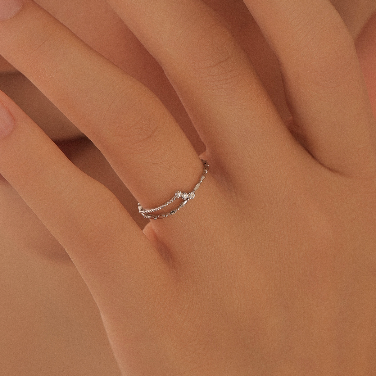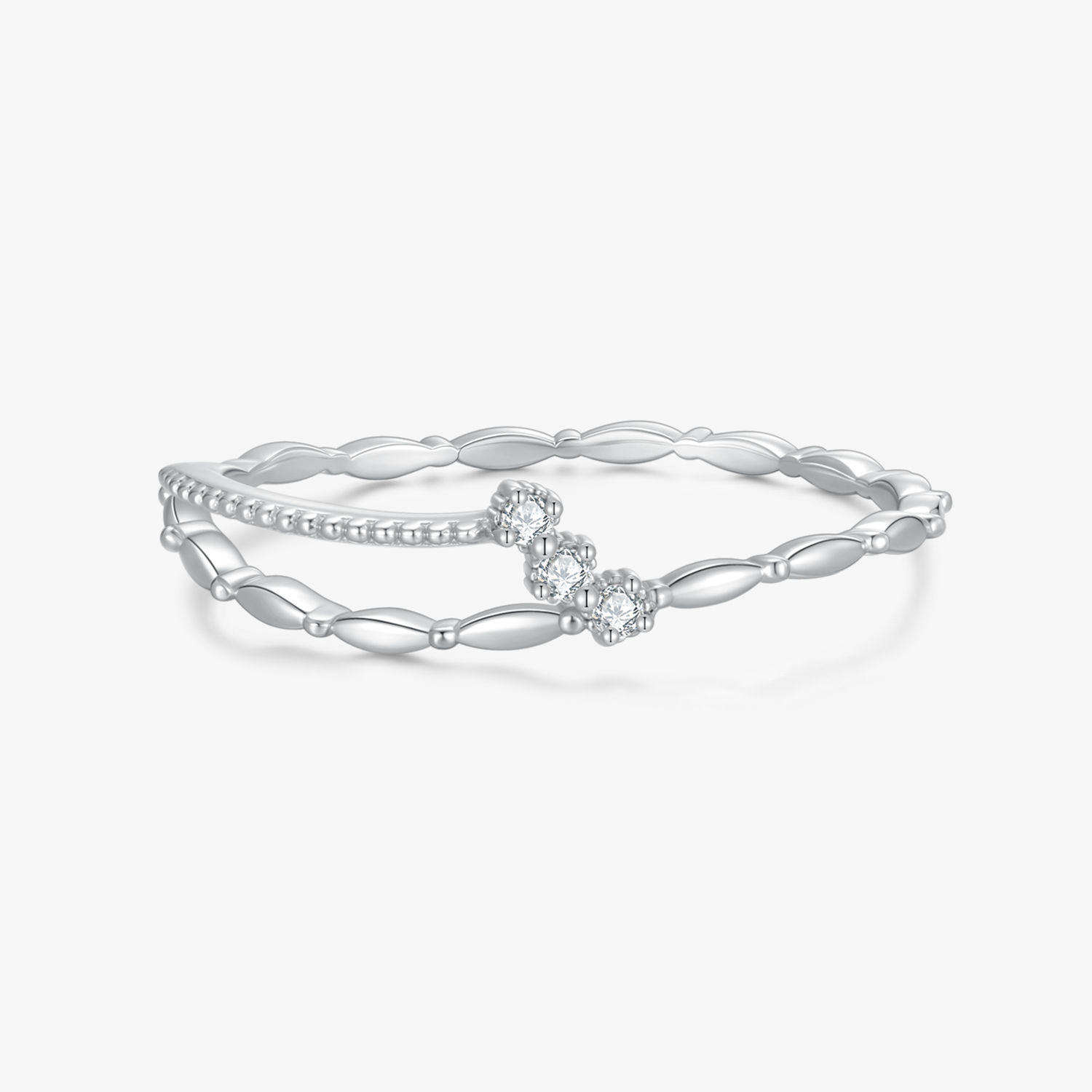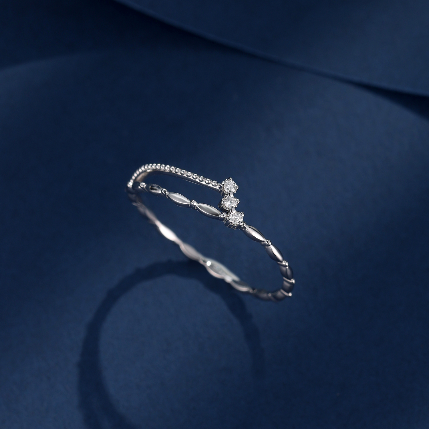 採用「雙層交錯式戒圈」結構,將帶有細膩顆粒感的柔光珠鏈,與立體琢形的閃耀菱形造型巧妙融合。三顆甄選鉆石以不規則的排列錯落鑲嵌,瞬間打破幾何線條的沉靜,為整個設計注入靈魂與高級定制感。