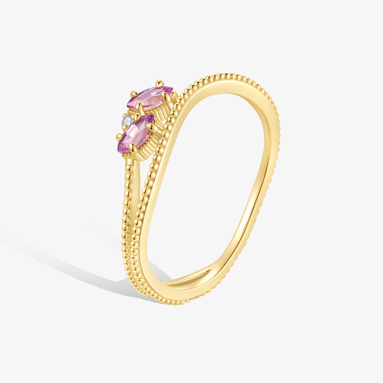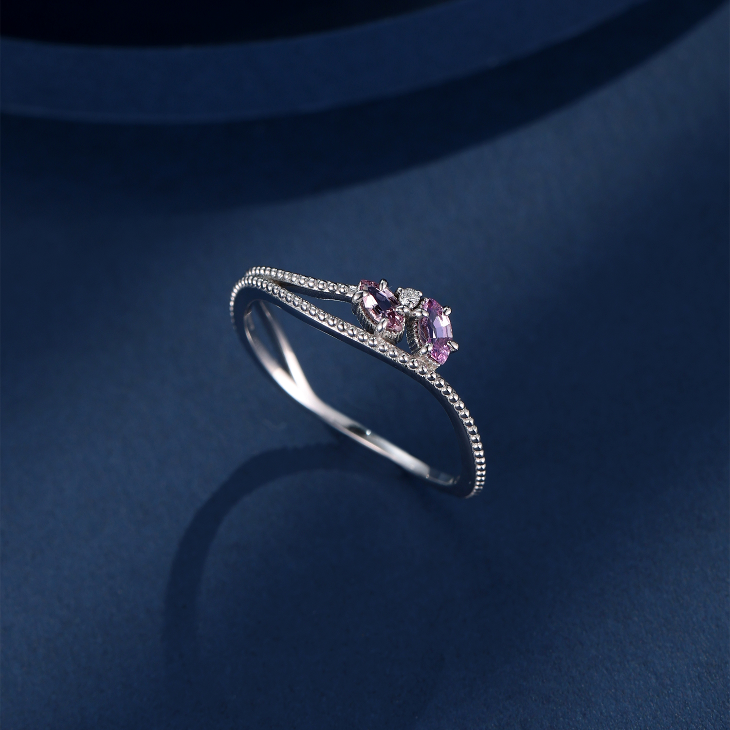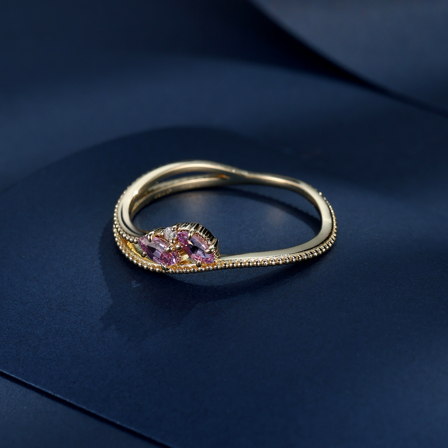匠心獨運的「雙波浪交錯結構」,將蘊含細膩顆粒感的靜逸波波珠,與線條流暢的靈動波浪精心融合。兩顆馬眼藍寶石與鑽石,依偎鑲嵌,構畫出如花瓣初綻、亦如蝶翼翩躚的唯美意象,彷彿將晨曦的溫柔與露珠的清亮永恆定格,為靈動的戒指注入一抹浪漫靈魂。